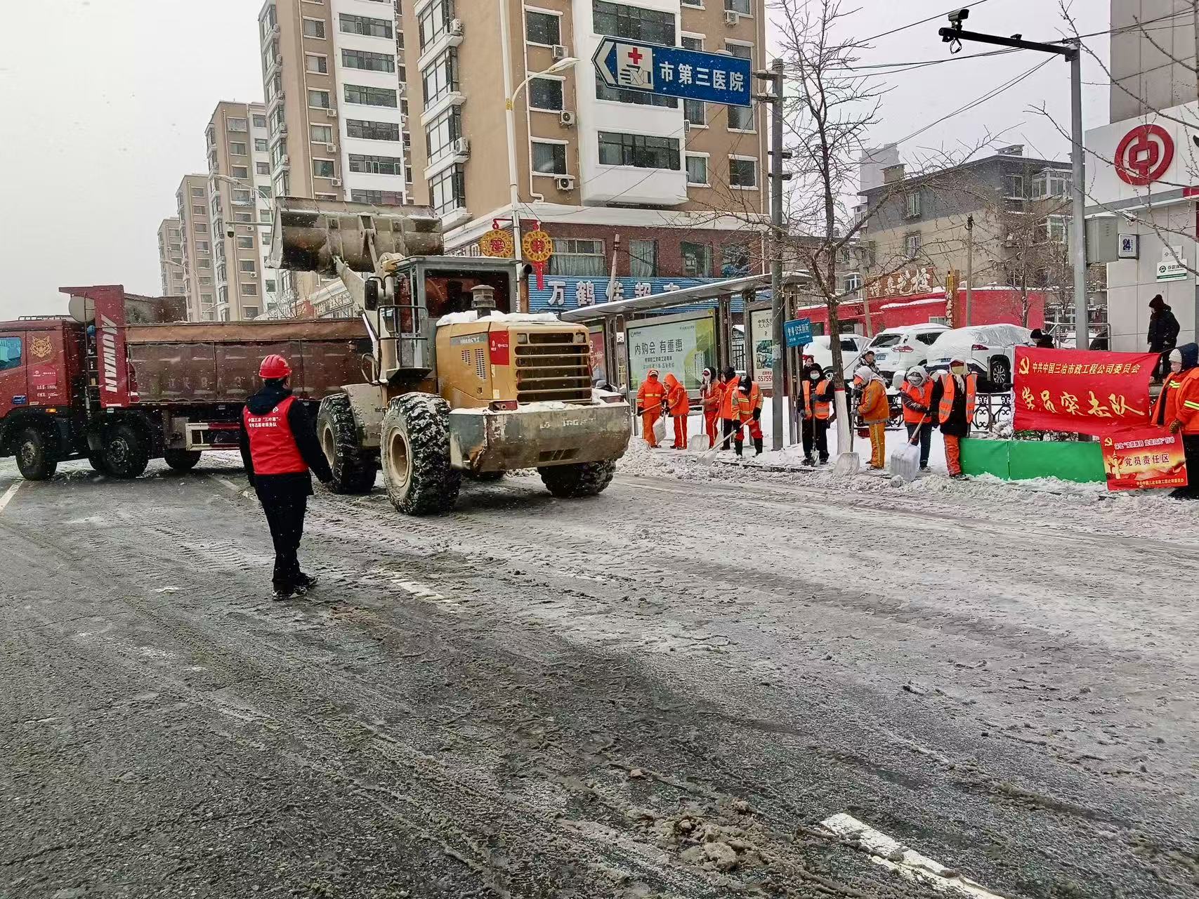 中國三冶此次掃雪除冰涵蓋立山區勝利路、雙山路、建國路三條重要交通主干道及沿途多條社區道路。由中國三冶市政公司臨時成立黨員突擊隊,派出4臺運雪車及3臺鏟車,在大雪寒風中邊下邊清,確保了春節前主要道路通暢,以實際行動踐行了三冶人的初心使命與責任擔當,讓黨旗在除雪除冰一線高高飄揚。